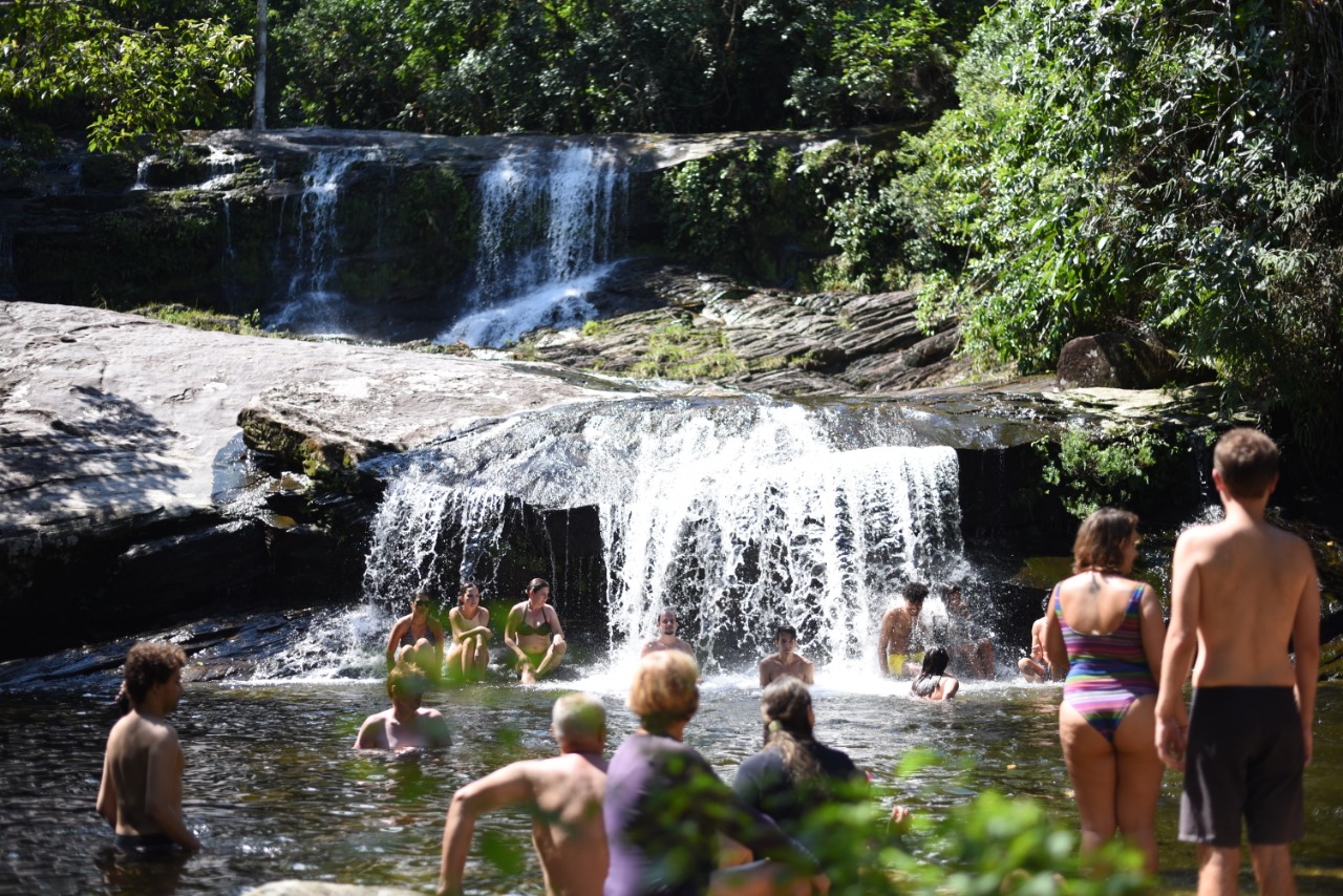Os índios levaram os visitantes para conhecer a cachoeira da aldeia – Foto: Marcela Leite