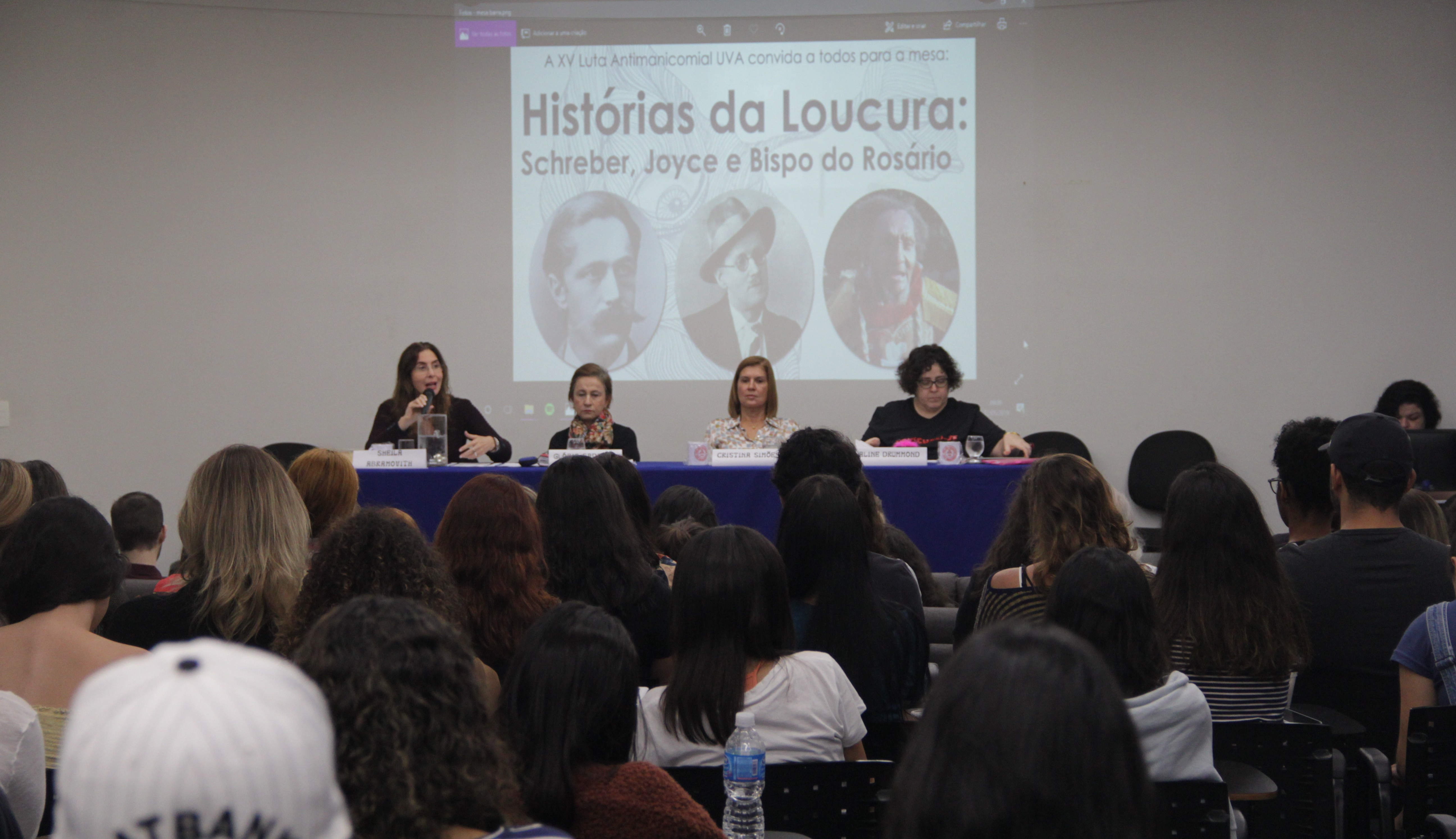 A abertura da XV Luta Antimanicomial teve como convidada a coordenadora da Luta, Aline Drummond, a coordenadora do Doutorado em psicanálise, saúde e sociedade, Glória Sadala, a coordenadora geral do curso de psicologia, Cristina Simões, e a psicanalista Sheila Abramovith. Sob o título “Histórias da Loucura”, as especialistas discutiram a respeito da vida e obra de Daniel Paul Schreber, James Joyce e Bispo do Rosário. Você pode entender mais sobre como “A arte permite a loucura” na matéria escrita pela repórter Graziela Andrade.