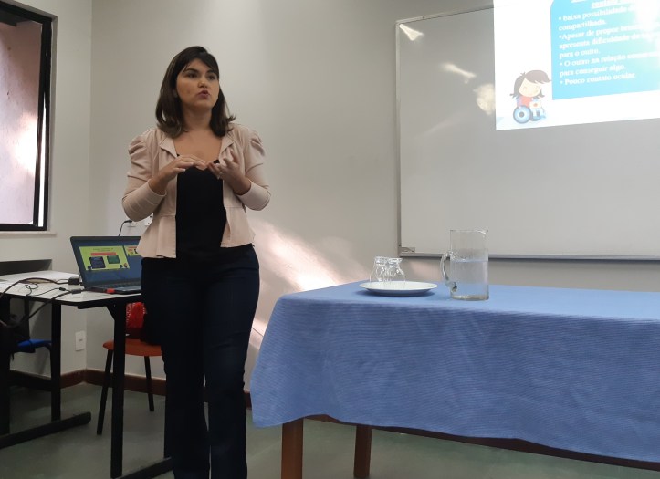 O segundo dia (28/05), abordou novamente o Autismo, com a presença da psicóloga e mestre em Psicologia Cognitiva, Andreza Moraes. Ela explicou aos futuros psicólogos interessados a seguir essa área, como ocorre o trabalho de avaliação e reabilitação em crianças com transtorno do espectro autista. “A avaliação neuropsicológica é um instrumento para observar a linguagem, o pensamento, a atenção e a capacidade de cognição social”, explica Andreza. Traçado o perfil do paciente, a reabilitação procurar melhorar o desenvolvimento dessas habilidades que estão prejudicadas.