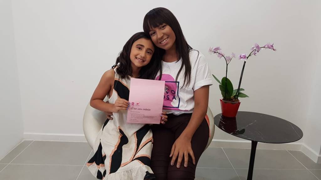 Dayana Souza, de 35 anos, conta que a sua filha Maria Eduarda, de oito anos, doou parte do cabelo e se sentiu muito feliz em conseguir realizar esse gesto de carinho. Laura Ramos de Azevedo luta contra o câncer desde 2014 e foi quem recebeu os fios de Duda. “A Duda amou conhecer a Laura, ficou passando a mão no cabelo dela admirada com a peruca; disse que agora eram amigas de cabelo”, comenta a mãe de Duda sobre o encontro das duas em julho deste ano.