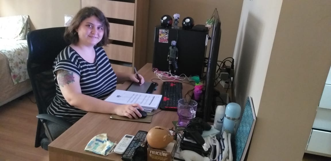 Uma dupla adaptação. A novata na Agência, Clara Tarquini, do quinto período de publicidade, começou o estágio nesse semestre e está sentindo dificuldades com o esquema de home office. A aluna ficou responsável pela parte gráfica, como photoshop e illustrator, além de desenvolver as peças para o Facebook e Instagram. “O que eu mais sinto falta é de poder virar e perguntar para o professor ou algum outro estagiário mais experiente se meu trabalho está certo. O processo de enviar o projeto, esperar que recebam, visualizem, abram e me respondam, demanda um tempo muito maior”.