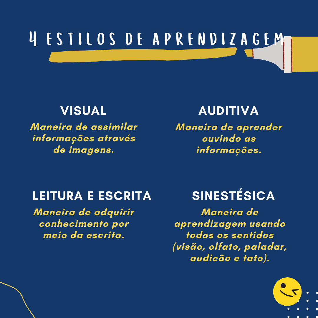 Margareth afirma que há algumas técnicas e estilos de aprendizagem que podem auxiliar na melhor absorção dos conteúdos e deixar a rotina um pouco mais dinâmica. Para isso, basta saber com qual mais se identifica.