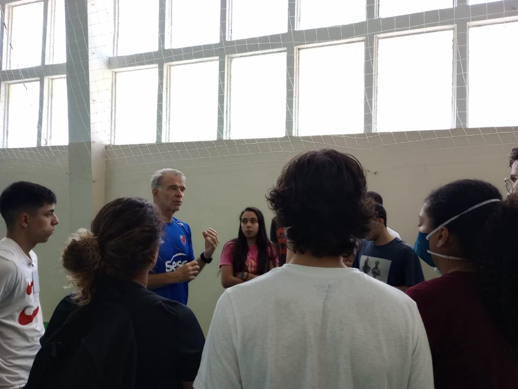 Na quadra, o voleibol mobilizou os estudantes. Quem participou foi Sara Zanco, 4º período de Educação Física. A prática exigiu a divisão de equipes com jogadores de defesa e centrais com levantadores. “O Bernardinho explicou como foi realizado o treino, ratificando o que o seu auxiliar tinha falado e a importância do planejamento pensando na prevenção de lesões, como por exemplo o excesso de saltos”, contou.