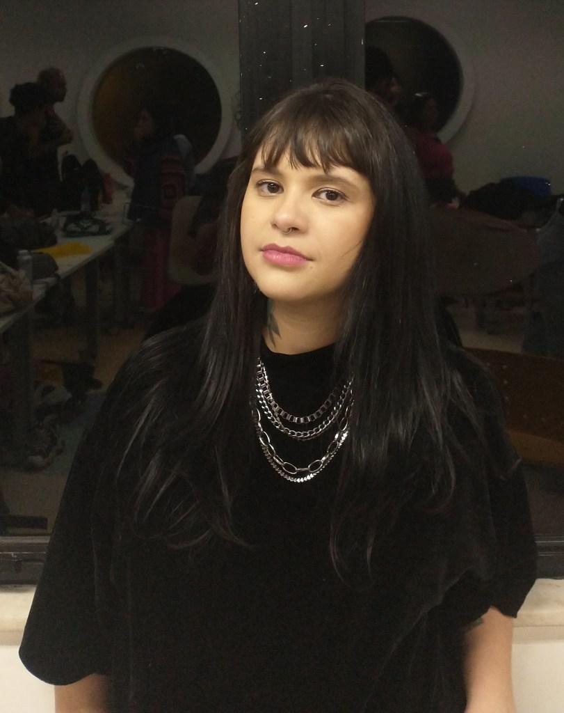 “A minha coleção é de moda de praia. Então eu tenho um biquíni com parte de cima, parte de baixo e um kimono; e tenho um outro biquíni, que tem a parte de cima e a parte de baixo aparece um pouco, com uma calça comprida. A minha coleção é inspirada também na Família Addams, então usei tanto os vieses dos personagens, quanto elementos característicos deles, para desenvolver a coleção”, explicou a graduanda.