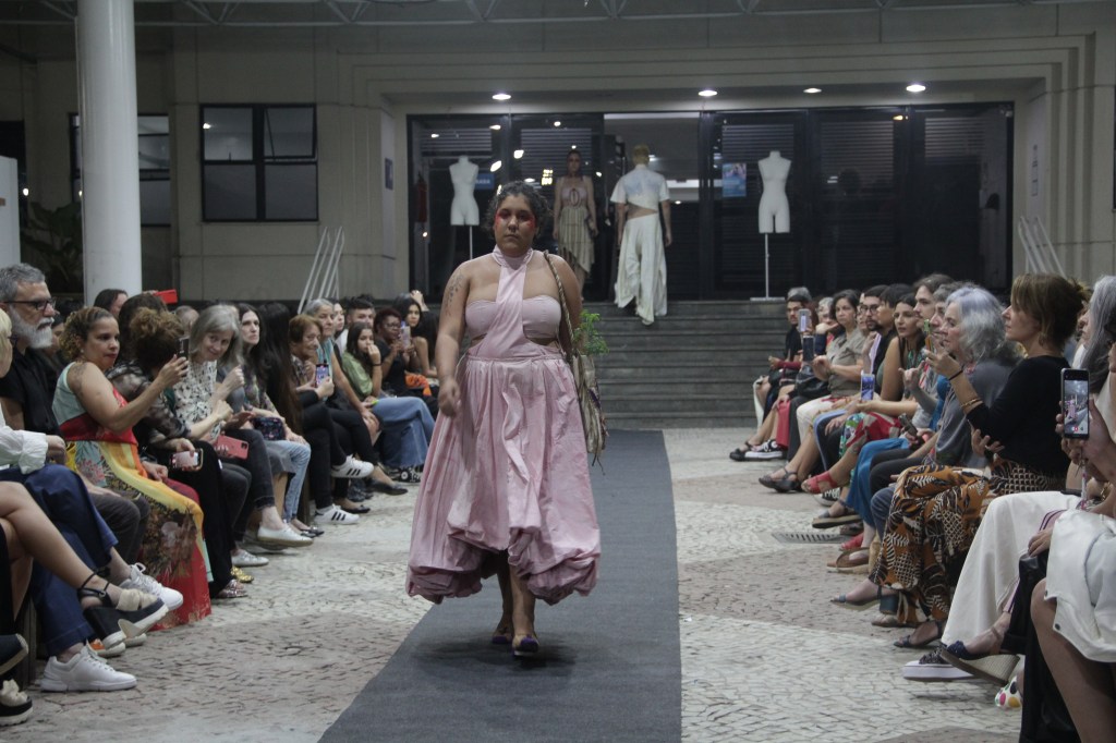 Já a aluna Rayene Arruda Esteves, 29 anos, que desenvolveu um par de vestidos, foi mais voltada para o sentido cronológico do tempo, buscando referências em culturas do passado. “Fui inspirada nas três Graças. São deusas da mitologia grega, muito relacionadas à Afrodite, deusa da beleza. E eu falo sobre a criação, o feminino, e a celebração desse feminino. Tudo muito relacionado e inspirado na natureza, também”, completou.
