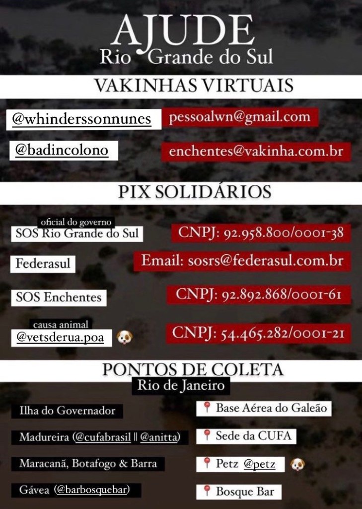 Alimentos não perecíveis, água mineral e itens de higiene e limpeza são o foco da campanha de doação. É possível também contribuir financeiramente para ONGs que estão ativamente envolvidas em prestar assistência às pessoas necessitadas