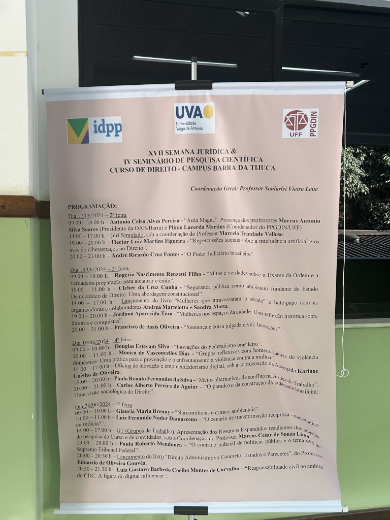 A XVII Semana Jurídica e o IV Seminário de Pesquisa Científica do curso de Direito, realizados no Campus Barra, ocorreram entre segunda-feira, dia 17, e quinta-feira, dia 20. O evento reuniu profissionais e acadêmicos para a apresentação de pesquisas e a discussão dos desafios contemporâneos na área jurídica. Este espaço de reflexão e troca de experiências abordou temas relevantes para o Direito, incluindo a apresentação das produções dos profissionais.