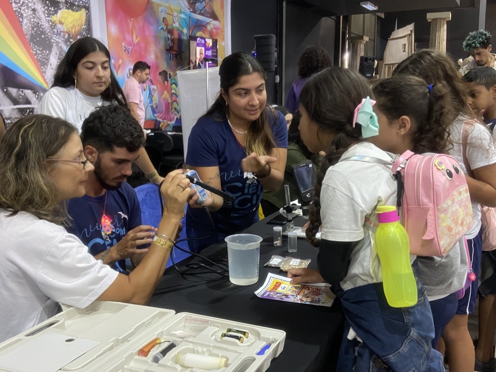 O projeto “Imersão”, presente no espaço, é uma parceria entre a Universidade Veiga de Almeida e a Prolagos, focada no monitoramento ambiental na região dos lagos. “Dentro do projeto Imersão, a gente faz monitoramento da qualidade da água, dos corpos hídricos da Região dos Lagos,” explicou João Vitor, engenheiro ambiental e integrante do projeto. No festival, João Vitor estava com um microscópio, mostrando os microplásticos, que são o foco principal do projeto apresentado. “O ser humano tem produzido cada vez mais plástico e consumido sem reutilização adequada, o que leva à poluição ambiental e afeta tanto animais quanto seres humanos,” explicou ele. “É muito importante a gente trocar a ideia com os jovens para que eles possam também levar para os mais velhos novos hábitos,” enfatizou, destacando a necessidade de consumir produtos biodegradáveis e com viés mais sustentável.