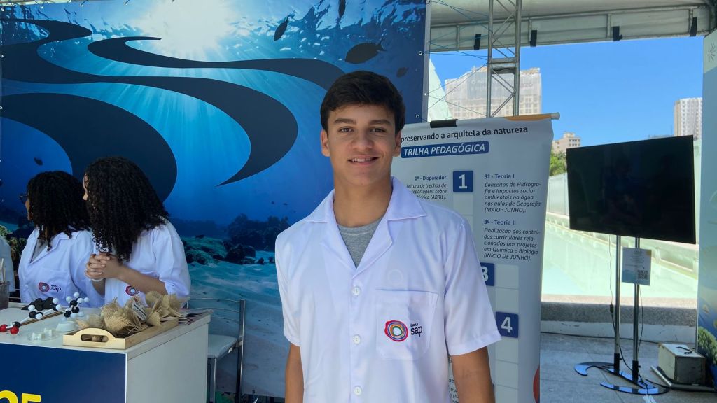 Um dos estudantes da escola SAP, Bernardo Habib, foi um dos participantes do projeto e contou como nasceu o projeto científico, a partir das aulas de geografia, química e biologia, ampliando sua visão sobre o meio ambiente. “A gente aprendeu sobre a geopolítica do petróleo e o quanto o descarte no mar é perigoso, isso me despertou um interesse muito grande e me fez querer saber como evitar isso para ter uma forma de reduzir a poluição do mar. Essa é a minha primeira vez no evento e tá sendo muito legal estar em uma conferência tão grande, e poder ver o impacto do nosso trabalho, assim como, conhecer especialistas na área e outros projetos, isso só me faz querer seguir cada vez mais essa área”, relatou Bernardo.